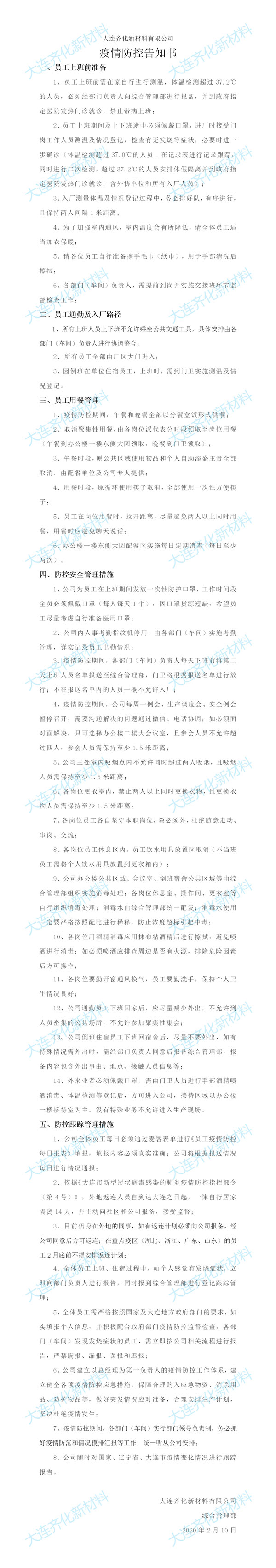 大連齊化新材料發布《疫情防控告知書》